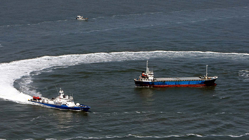 ▲2일 밤 서해 대청도 인근 해상에서 발생한 저인망 어선 금양98호와 충돌한 것으로 추정되는 캄보디아 화물선을 해경 312 함정이 3일 공해상에서 대청도앞바다로 이동시키고있다. ⓒ공동취재단