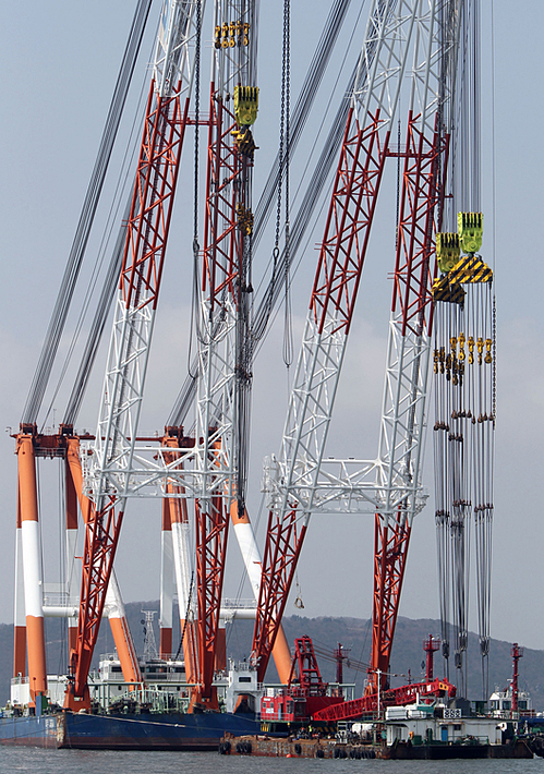 ▲천안함 침몰 23일 째인 17일, 백령도 앞바다 천안함 함수 침몰 해역에 떠 있는 해상 크레인. 인양팀은 이날 오전까지 함수를 인양하는데 필요한 체인 4개 가운데 2개를 연결했고, 현재 3.4번째 유도용 와이어 2개를 함체에 연결하는 작업을 진행하고 있다. ⓒ연합뉴스