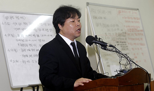 | ▲21일 이정국 실종자가족협의회 대표가 평택 2함대사령부에서 본격적인 장례논의 시작과 실종자가족협의회 해체, '천안함 전사자가족협의회'(천전협) 출범을 설명하고 있다. ⓒ사진공동취재단 |