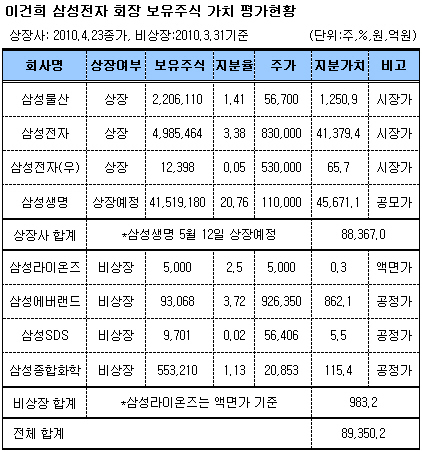이건희 회장 가족 전체의 상장사 지분가치도 부인 홍라희 씨와 장남 이재용 삼성전자 부사장이 각각 8989억 원, 6975억 원을 기록해 삼성생명 상장 이후 10조 원대에 달할 전망이다.