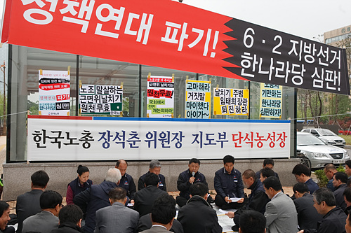장석춘 위원장 등 한국노총 지도부 7명은 이날 오전 서울 여의도 국회의사당 앞에서 기자회견을 열고 "오늘부터 무기한 단식 농성에 들어간다"고 밝혔다. 한국노총 위원장의 단식농성은 지난 2005년 비정규직 관련법 제정을 둘러싸고 민주노총 위원장과 공동으로 벌인 뒤 5년 만이다.