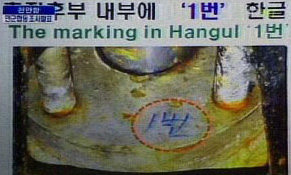 | ▲ 합조단이 '결정적 증거'라며 공개한 어뢰 추진체에 쓰여진 '1번'이라는 손글씨. |