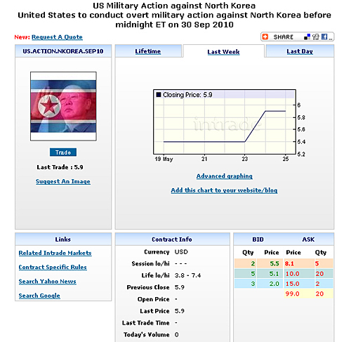 기상천외한 일들을 두고 선물거래를 주선하는 미국의 온라인 거래사이트 '인트레이드닷컴'이 개설한 한반도 관련 상품이 눈길을 끌고 있다. 미국인들은 이명박 대통령이 천안함 관련 대국민 담화를 발표한 이후 '미군이 북한을 연내 공격할 가능성이 있다'는 쪽에 보다 많은 판돈을 걸기 시작했다.