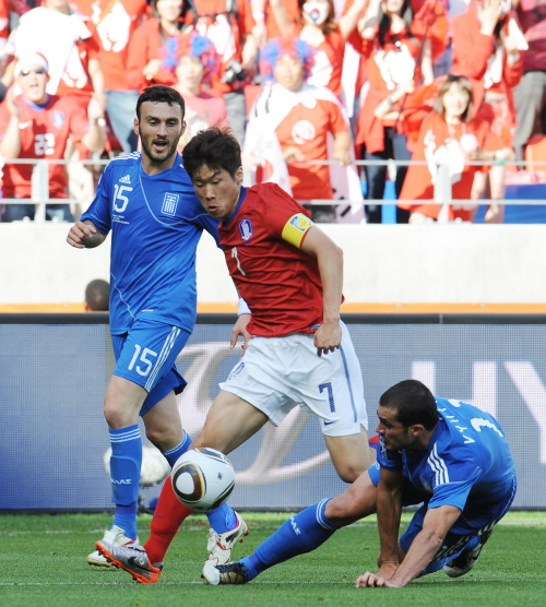 | ▲ 12일(한국시간)오후 남아공 포트 엘리자베스 만델라 베이 스타디움에서 열린 2010 남아공월드컵 B조 대한민국과 그리스의 경기에서 박지성이 빈트라와 토로시디스(그리스)의 수비를 피해 돌파를 시도하고 있다.ⓒ뉴시스 |