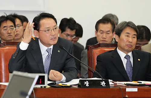김 의원의 '지분 논란'에 신 차관은 특별한 답변을 하지 않았고, 뒤이어 질의에 나선 한나라당 이병석 의원이 맞받아쳤다. 이 의원은 마이크를 잡자마자 신 차관에게 "이 정부에 지분 몇 퍼센트나 가지고 있냐"고 물었다. 신 차관이 "별 거 없다"고 답하자, 이 의원은 "허위 사실이죠"라고 쐐기를 박았다.