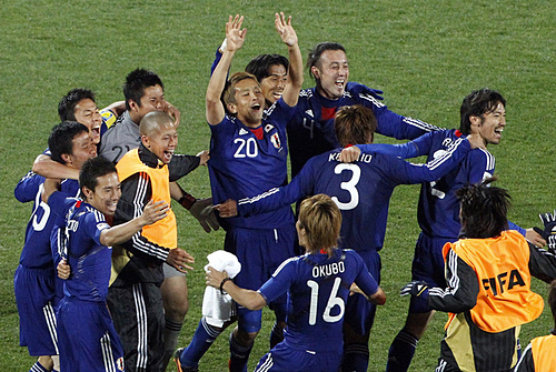 | ▲ 일본 대표팀 선수들이 남아공 월드컵 16강 토너먼트 진출을 확정한 후 기쁨을 나누고 있다. ⓒEPA=연합뉴스 |