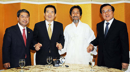 | ▲ 이재정 국민참여당 대표,정세균 민주당 대표,강기갑 민주노동당 대표,송영오 창조한국당 대표가 25일 여의도 한 호텔에서 오찬 회동에 앞서 손을 잡고 있다. ⓒ연합뉴스 |