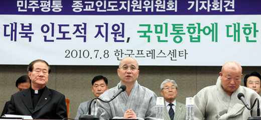 | ▲ 지난 8일 4대강 사업에 대한 공식 지지를 천명한 민주평통 종교인지도위원회 기자회견에 참석한 영담(가운데)과 성타 스님(오른쪽). ⓒ연합뉴스 |