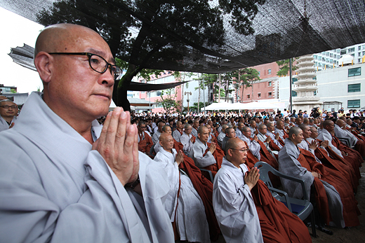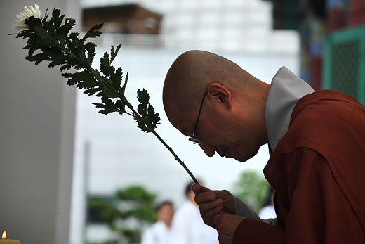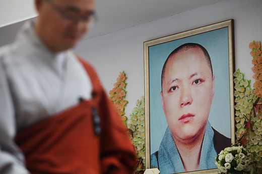 '4대강 사업 중단'을 촉구하며 지난 5월 소신공양(燒身供養·부처에게 공양하고자 자신의 몸을 불사르는 행위)한 문수 스님의 49재가 18일 오전 서울 조계사에서 봉행됐다.