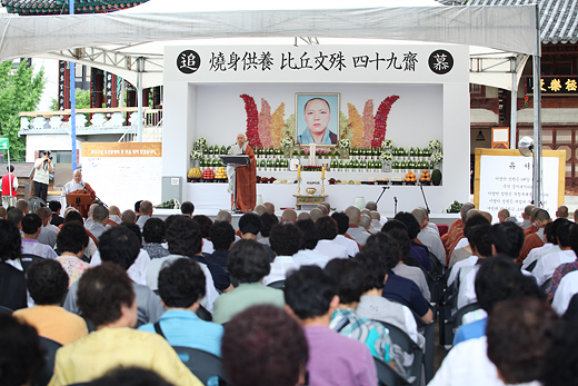 자승 스님은 "오늘 49재를 맞아 문수 스님의 자비와 공덕을 거듭 되새기며, 마지막으로 스님을 보내드린다"고 추모한 후, "뭇 생명의 아픔을 우리의 아픔으로 삼고, 세상을 구하는 일에 앞장서는 보현행자가 되어 우리 종단 사부대중은 함께 정진할 것"이라고 말했다.