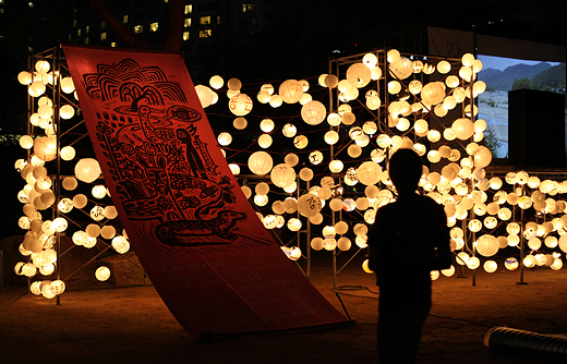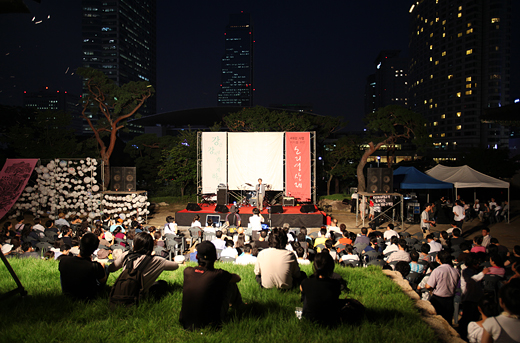 '4대강 사업 중단 문화예술인 시국선언'이 끝난 20일 오후 서울 삼성동 봉은사 보우당 앞. 해가 완전히 저문 시간이 되자, 시 낭송과 다큐멘터리 상영, 공연, 자유 발언이 이어지는 작은 음악회가 열렸다. 작가선언6.9를 비롯한 문화예술인들이 '4대강 사업 저지를 위한 소리영상제-강은 강처럼 흐르게 하라'를 마련한 것.