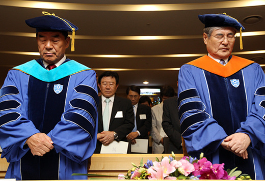| ▲ 기도하는 '두 총장'. 7일 연세대에서 열린 고려대 이기수 총장의 명예박사 학위수여식에서 이기수 총장(왼쪽)과 김한중 총장이 기도하고 있다. ⓒ연합뉴스 |