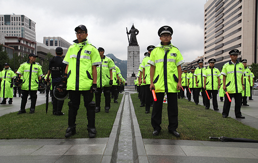 | ▲ 11일 광화문광장을 가득 메운 경찰 병력. 결국 이날 집회는 경찰의 불허 방침으로 보신각 일대에서 진행됐다. ⓒ프레시안(최형락) |