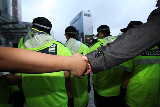 | ▲ 11일 서울 도심에서 열린 '4대강 사업 중단을 촉구하는 1차 국민행동'에서 참가자들이 경찰의 제지를 뚫고 인간띠 잇기를 시도하고 있다. ⓒ프레시안(최형락) |