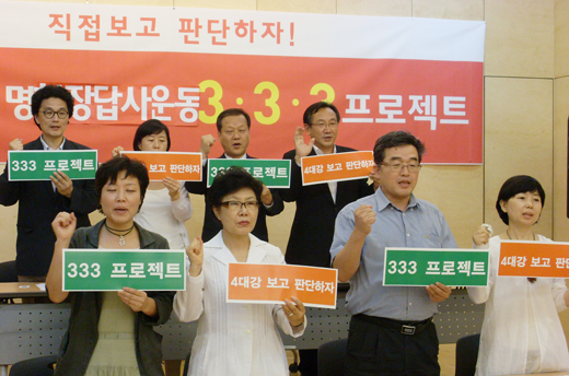 '4대강 현장 답사 333프로젝트 기획단'은 14일 서울 정동 환경재단에서 출범식을 갖고, 오는 17일부터 11월 중순까지 시민 1만 명 참가를 목표로 4대강 현장 답사를 진행한다고 밝혔다. '333프로젝트'는 333대의 버스에 33명의 참가자를 태우고 현장 답사를 추진한다는 의미다.