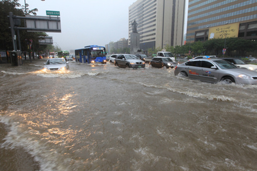 | ▲ 21일 내린 폭우로 물에 잠긴 광화문 사거리. ⓒ연합뉴스 |