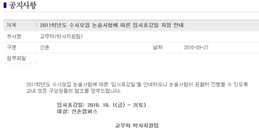27일 연세대학교 교무처는 전교생을 대상으로 2011학년도 수시입학전형 논술고사에 따른 임시 휴강을 공지했다. 내달 2일로 예정된 논술고사 준비로 인해, 하루 앞선 1일의 수업까지 모두 휴강된 것.