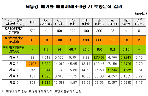 국회 환경노동위원회 소속 이찬열·홍영표·이미경 의원(민주당)과 국토해양위원회 소속 김재윤 의원(민주당)이 지난 2일 낙동강 8~9공구 매립 폐기물의 시료를 채취해 부산동의과학대학 동의분석센터에 토양오염도 분석을 의뢰한 결과, 유류 성분의 오염 여부를 측정하는 TPH(석유계총탄화수소)성분이 2908mg/kg 검출됐다. 이는 토양환경보전법상 '토양오염 우려기준'인 800mg/kg보다 3~4배가량 높은 수치다.