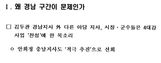 특히, 이 문건 중 '왜 경남 구간이 문제인가'라는 대목에는 "김두관 경남지사 외 다른 야당 지사, 시장·군수들은 4대강 사업 '찬성'에 한 목소리"를 내고 있고, "안희정 충남지사도 '적극 추진'으로 선회"했다는 내용이 담겨 있어 논란이 확산되고 있다.