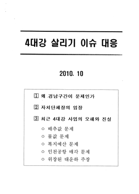 총 20쪽으로 작성된 문건은 4대강 사업과 관련한 지방자치단체장의 입장, 대운하를 비롯한 4대강 사업을 둘러싼 논란 등의 내용을 담고 있다. 이 문건은 환경부 종합감사 이틀 전인 19일 국회 환경노동위원회, 국토해양위원회, 농림수산식품위원회 등 4대강 사업 관련 상임위 소속 여당 의원들에게 전달된 것으로 밝혀졌다.