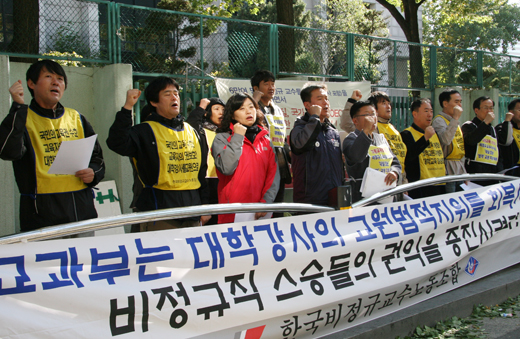 한국비정규교수노동조합(한교조)은 26일 서울 세종로 정부종합청사 후문에서 기자회견을 갖고, "사회통합위원회의 방안은 기존 시간강사 제도의 변형에 불과한 속 빈 강정"이라며 이 방안의 문제점을 조목조목 지적했다. 이들은 지난달 6일부터 시간강사의 법적 지위 회복을 위한 농성을 교과부 후문 앞에서 벌여왔다.