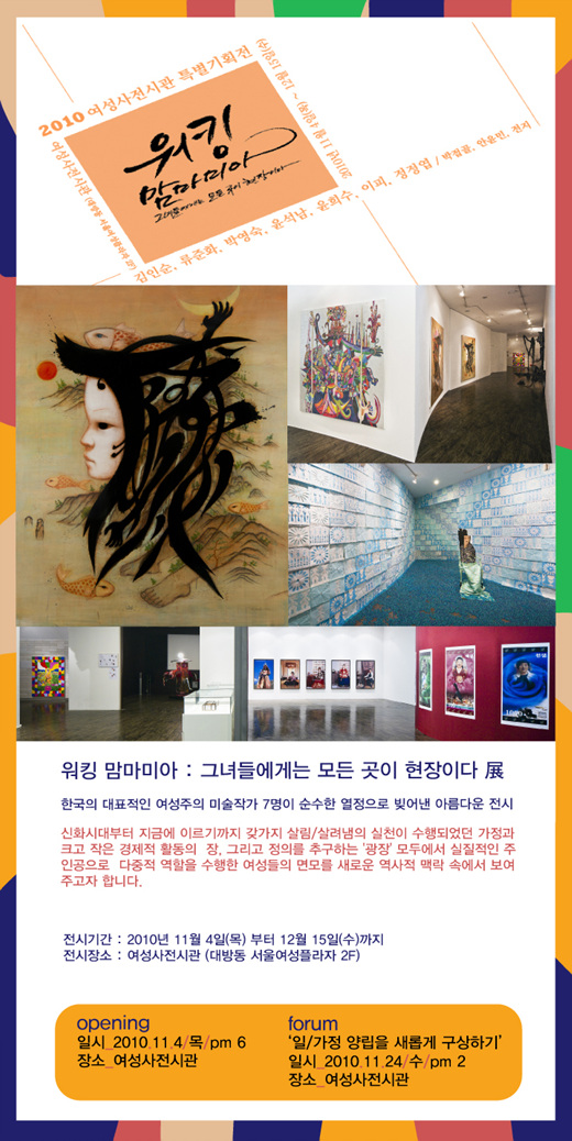 전시 오프닝은 4일 오후 6시이며, 전시는 15일까지 서울 대방동 여성플라자 내 여성사전시관에서 계속된다. 오는 24일에는 '일과 가정 양립을 새롭게 구상하기'라는 주제의 포럼 역시 열릴 예정이다. 문의는 02-824-3086(여성사전시관).