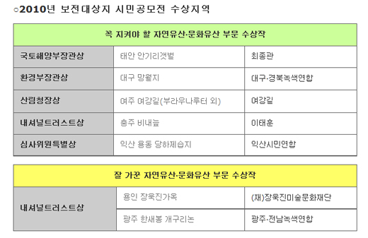 11일 한국내셔널트러스트에 따르면, 지난 8일 이 단체 주최로 서울 예장동에서 열린 '이곳만은 지키자-2010년 보전대상지 시민공모전' 시상식에서 환경부·국토해양부 고위급 간부들이 수상 대상 중 일부가 4대강 사업 구간에 해당된다며 노골적으로 불만을 표시했다.
