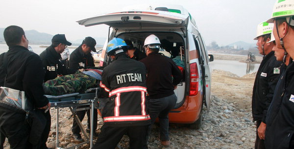 | ▲ 17일 오후 남한강 이포대교 인근에서 훈련 중 전복된 군 보트에 탑승하고 있던 군인이 병원으로 후송되고 있다. ⓒ경기도소방재난본부 |