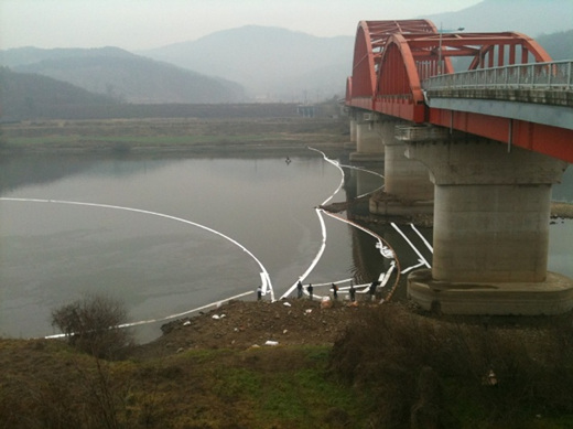 ▲ 금강유역환경청 관계자들이 신공주대교까지 흘러내려온 기름을 제거하기 위해 오일펜스를 설치하고 방재 작업을 벌이고 있다. ⓒ4대강범대위