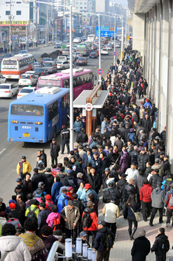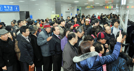 | ▲ 경춘선 복선전철이 개통된 지난 21일, 전철 무인발권기에 노인관광객들이 붐비고 있다. 65세 이상 노인은 전철을 무료로 이용할 수 있다. ⓒ연합뉴스 |