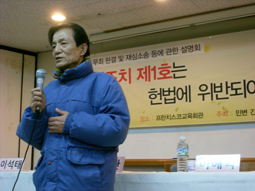 이어 그는 "(긴급조치 1호에 대한 위헌 판결은) 유신체제의 사생아인 이명박 정부를 타도하기 위한 싸움의 시작일 것"이라며 "그 싸움에 부디 이 늙은이도 끼워달라"고 밝혀 박수를 받기도 했다.