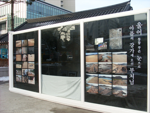 14일 서울 종로구 견지동 조계사 경내에 사진으로 단장한 컨테이너가 들어섰다. 사방이 유리창인 이 '상설 전시 공간'엔 발파 공사로 구멍이 뚫린 낙동강의 마애부처상, 4대강 공사로 파헤쳐진 낙동강 '제1비경' 경천대의 사진이 내걸렸다. 볼품 없던 5.5평의 작은 공간이 '모래, 강, 그리고 아픔'을 주제로 한 사진 전시관으로 선을 보인 것.