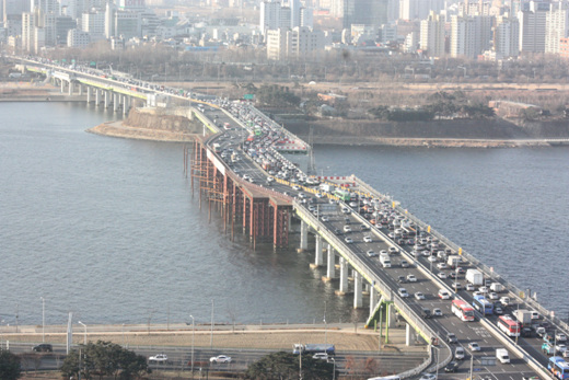 | ▲ 'ㄷ'자 모양으로 굽은 양화대교. 이 공사로 지난달과 이번달 양화대교를 건너던 승용차와 버스가 중앙분리대를 들이받는 등 안전 사고가 속출하고 있다. ⓒ서울시 |