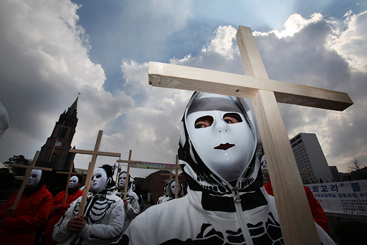 | ▲ 후쿠시마 원자력발전소 사고로 인한 방사성 물질이 국내에서도 광범위하게 검출됐다. 사진은 쓰리마일섬 원전 사고 32주기를 맞아 28일 서울 명동성당 앞에서 퍼포먼스를 벌이는 환경운동연합 회원들. ⓒ프레시안(최형락) |