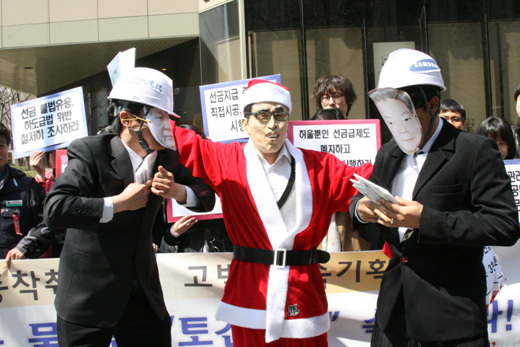 | ▲ 건설노조 조합원들이 4대강 사업 선금을 통해 건설재벌들을 배불리는 정부를 비꼬는 퍼포먼스를 벌이고 있다. ⓒ프레시안(선명수) |