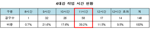 안 의원이 공개한 '4대강 사업장 작업 시간 현황' 자료를 보면, 법정 근로시간인 하루 8시간 작업을 하는 공구는 단 한 곳에 불과했고, 12시간 이상 일하는 곳이 31곳으로 전체의 20%를 웃돌았다.