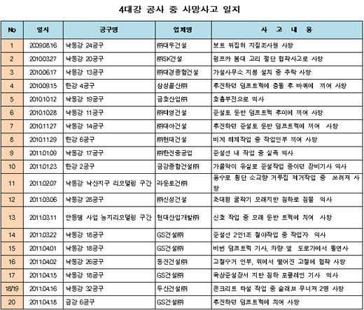 지난 18일 오후 4대강 사업이 진행 중인 금강 6공구 현장에서 굴착기 기사 김모(51) 씨가 후진하던 덤프트럭에 치여 숨졌다. 이로써 4대강 사업이 시작된 이래 공사 현장에서 숨진 건설 노동자는 모두 20명으로 늘었다.