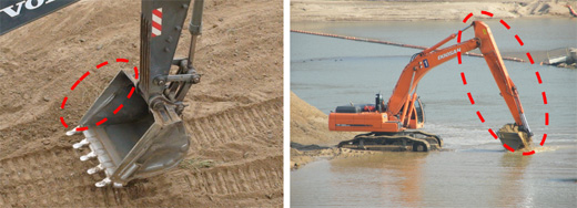 | ▲ 더 많은 골재를 단시간에 퍼내기 위해 불법 개조한 굴착기. ⓒ건설노조 |