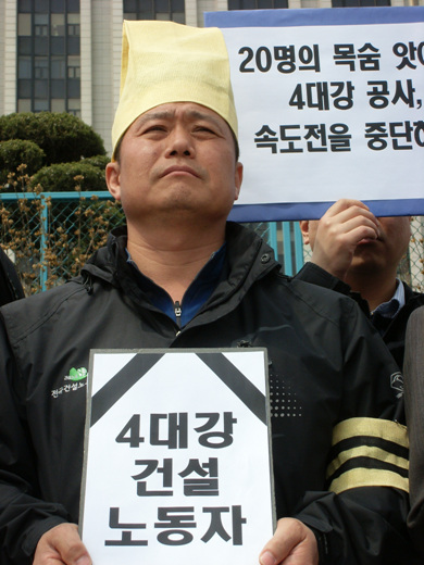 | ▲ 한 건설노동자가 4대강 공사 현장에서 숨진 노동자들을 추모하는 손팻말을 들고 있다. ⓒ프레시안(선명수) |