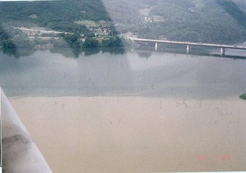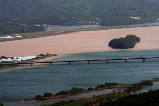| ▲ 남한강의 황톳빛 물(사진 위쪽)이 북한강의 푸른 물빛과 선명한 대조를 이루고 있다. ⓒ농지보존·친환경농업사수를위한팔당공동대책위원회 |