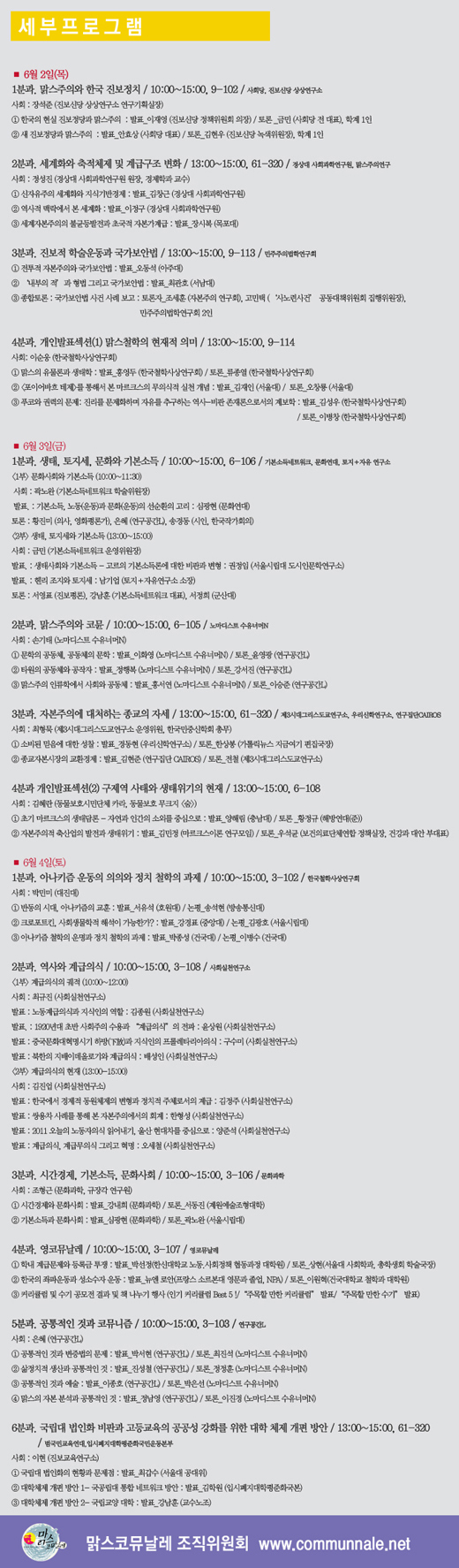 행사의 '대미'는 4일 오후 열리는 5부 종합토론. 앞서 진행된 4개 세션에 대한 종합 논평 격인 이 토론에선 심광현 한국예술종합학교 교수가 발제자로 나서며 강내희 중앙대 교수, 고정갑희 한신대 교수, 손호철 서강대 교수, 최무영 서울대 교수가 토론자로 참여한다.