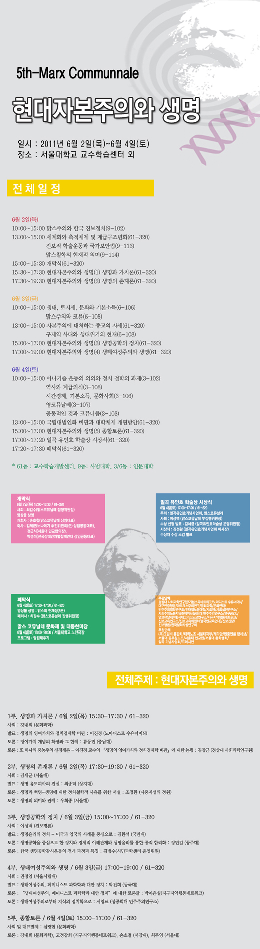 학술대회 집행위원장을 맡은 최갑수 서울대 교수(서양사학과)는 "이제 '생명'은 인간중심적이고 기술유토피아적인 근대성 패러다임 자체에 심각한 문제를 제기할 뿐만 아니라 맑스주의 자체를 둘러싼 논쟁도 야기하고 있다"며 "이번 코뮤날레는 생명을 포획하고 착취하면서 생명의 경계를 해체하는 현대 자본주의의 지평을 총체적으로 살펴보는 기회가 될 것"이라고 말했다.