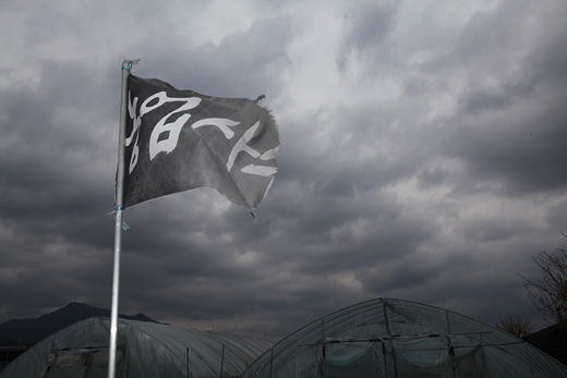 | ▲ 유기 농산물을 생산하는 비닐하우스 위로 '농업 사수'라고 쓰인 깃발이 보인다. ⓒ프레시안(최형락) |
