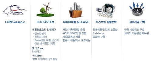 먼저 기존 PC방의 답답하고 담배연기로 자욱한 이미지에서 탈피한 청정PC방 구연에 있겠다. 라이온 PC에서는 황토, 숯, 음이온세라믹으로 도배 및 도장하고 옥서스 산소발생기를 설치해 맑은 공기와 쾌적한 환경을 조성해준다. 또한 라이온 PC에서는 전자동 매장관리 시스템과 가맹관리 시스템을 운영하여 작업을 자동화하고 게임버전 관리 및 설치, 수리를 해결해준다. 관리 프로그램 내 탑재된 인공지능이 꺼진 컴퓨터와 손님이 있는 PC를 구분하여 전 좌석의 프로그램을 관리하는 것이다. 또한 점포개발도 전국 네트워크를 구축하고 전문 컨설턴트를 통한 1:1 맞춤 상담으로 진행되어 경쟁력 있는 위치에 적합한 영업 전략으로 점포를 운영할 수 있게 도와준다. 또한 라이온PC에서는 카페와 안마의자, 닌텐도 게임, 편의점을 함께 운영할 수 있는 부가수익 창출전략도 제시하고 있다. 대출과 리스에 있어서도 적극 지원하여, 창업자의 부담을 줄이기 위해 노력한다.