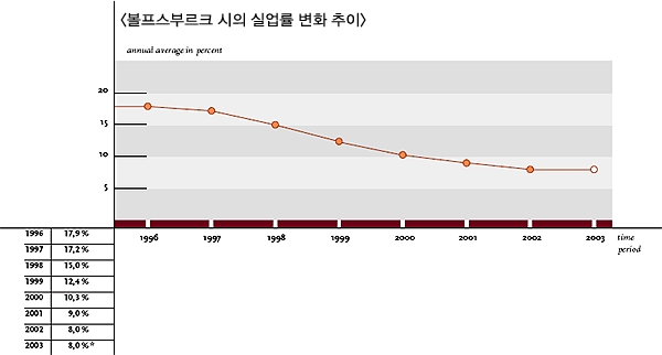 즉 폭스바겐의 불황이 볼프스부르크 시의 경제상황에 곧바로 영향을 미칠 수밖에 없는 구조였다는 것이다. 당시의 경제상황은 실업률에도 잘 드러난다. 1993년부터 상승하기 시작한 볼프스부르크 시의 실업률은 1997년에 최고 17.8%까지 치솟았다.