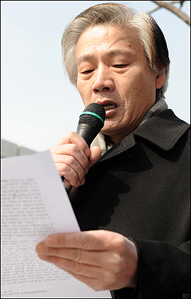 | ▲ 김세균 교수는 실천적 지성으로 살아왔다. 사진은 2008년 2월 18일 '한미FTA 비준 동의안 처리 반대' 기자회견문을 낭독하는 모습. ⓒ뉴시스 |