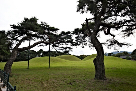 | ▲ 박혁거세와 왕비 알영, 기타 왕들 셋이 묻혀있는 경주시내의 오릉. 넓은 구역안에 능다섯기가 한자리에 모두 모여있어 곡선의 흐름이 한눈에 보인다ⓒ이순희 |