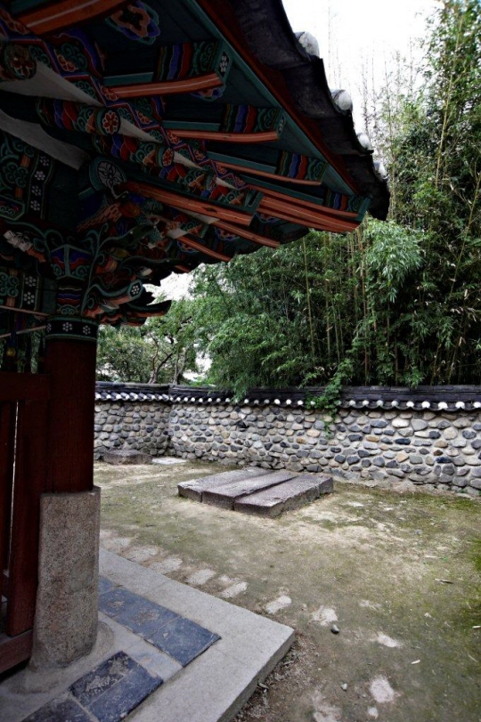 | ▲ 박혁거세의 왕비 알영의 우물이 비각 뒤에 있다. 지상의 우물벽은 없고 뚜껑삼아 덮어논 장대석 틈으로 땅속의 우물물이 조금 보인다. 비각 안에는 후대에 세운 기념비가 있다. 알영정이란 돌 표지석이 옆건물 연못 옆에 있어 혼란스럽다ⓒ이순희 |