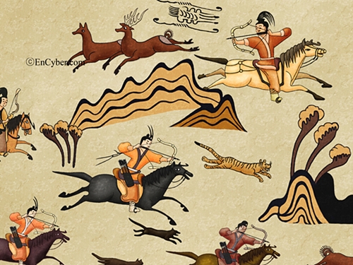 | ▲ 5-6세기 고구려 무용총 수렵도의 호랑이. 고구려인의 사냥장면을 보여주는 이 벽화에서 혀를 빼물고 눈이 뒤집힌채 쫓기는 절박한 상황의 호랑이가 그려졌다. 한국의 가장 오래된 호랑이 그림이다. |