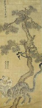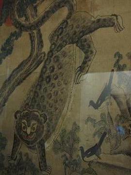 작년 여기서 정말로 재미난 호랑이그림을 보았다. 산중의 장기대회 같은 게 열린 듯 소나무 밑에서 물구나무 서기 재주를 부리는 어린 호랑이가 있고 그 옆에 까치 둘이 쳐다보면서 '야 잘 한다, 네 재주 좋구나.' 하고 재밌게 노는 분위기다. 정작 어떤 말들이 오갔는지는 저희들만 아는 이야기일 것이다. 그림이 작지도 않고 엉성한 삽화같은 것도 아니었다. 조선의 어떤 화가이길래 천하의 맹수 호랑이가 이렇게 물구나무 서며 즐거운 시간을 보내는 장면을 그려낼 수 있는 것일까.